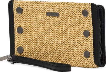 Signature rivets glint at the sides of this slim wallet outfitted with plenty of organized storage and an optional wrist strap.
