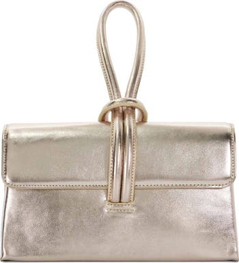A tubular handle loops over the flap of a metallic faux-leather clutch serving as a secure closure and wrist strap for convenient wear on your next evening out.