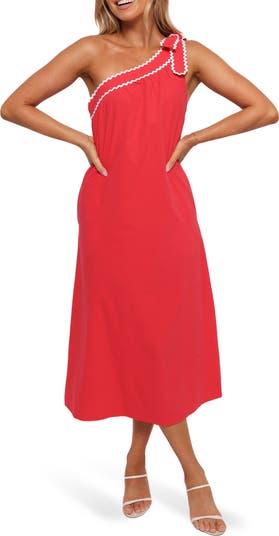 Rickrak trim draws attention to this flowy, summery midi dress made of lightweight cotton and fashioned with a bow-accented one-shoulder neckline.