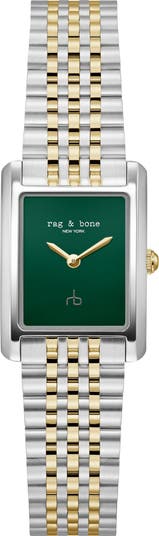 A minimalist dial adds streamlined elegance to a slim rectangular watch designed in a scaled-down profile and fitted with a two-tone bracelet.
