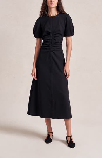 An update to a bestselling dress in luxurious Italian stretch crepe, featuring flattering shirring and pleated sleeves for effortless day-to-night style.