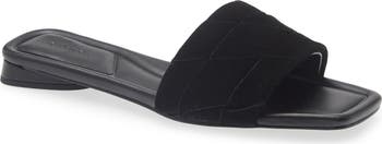 Interwoven leather panels bring subtle dimension to a minimalist slide sandal featuring a cushioned footbed and mini block heel for walkable comfort.