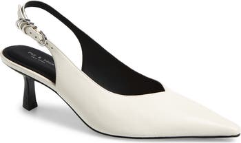 A V-cut topline and snip toe bring crisp angles and dimension to a slingback leather pump grounded by an OrthoLite® footbed and svelte kitten heel.