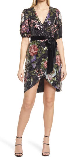 Brilliant sequins shimmer across the floral fabric of this satin short-sleeve dress that is wrapped with a beautiful velvet sash around the waist.