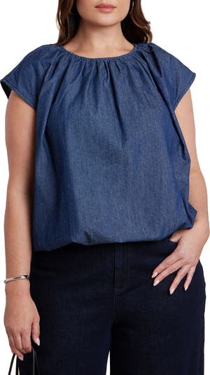 Refresh everyday dressing with this chambray top designed for soft volume. A shirred crew neckline and relaxed silhouette give it easy, modern charm.