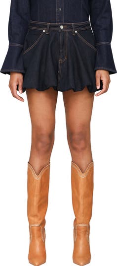 A bubbly hem brings volume and charm to this leggy-length jean skirt updated in a dark wash with pronounced topstitching.