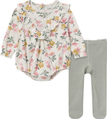 This baby girl bubble romper and tights set is thoughtfully designed for cooler days and picture-perfect moments. The long-sleeve romper features a charming V-neck ruffle and cinched wrists for a soft, secure fit. Flexible leg openings keep baby comfortable throughout the day, while easy snaps at the bottom make diaper changes simple. The matching footed tights have a comfort-stretch waistband to stay in place without pinching, making this outfit both cozy and complete. Our essentials have been independently certified with STANDARD 100 by OEKO-TEX® so that you don’t have to worry about harmful substances in your little one's wardrobe. Pack includes two-piece bubble romper and tights set from modern moments™ by Gerber®®.