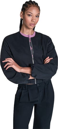 Subtle yet striking, this cotton twill bomber has modern edge and soft, puffy sleeves, bound to be your next layering fave.