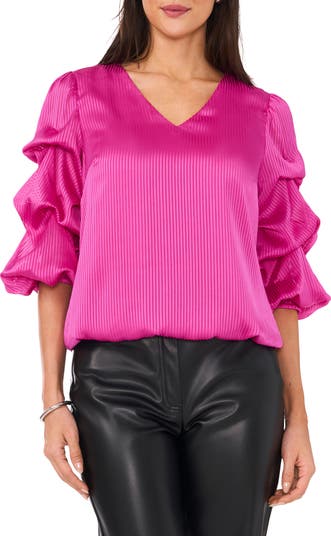 Voluminous bubble sleeves artfully frame this V-neck blouse made from a satin-striped chiffon fabric and cast in a vibrant shade.