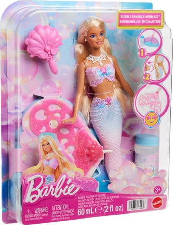 Open up a world of bubble-filled fun with this mermaid doll that's cutout tail fins make fantastical bubbles. Just pour the bubble solution (included) into the shell-shaped tray and dip the doll's tail fin into the solution. Also, pull the seashell tab on her tail send it spinning and watch tons of bubbles take flight.