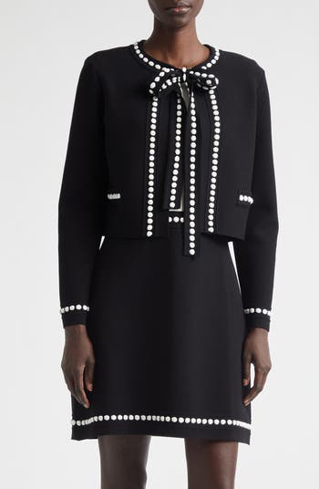 Designed to artfully balance polish and precision, this boxy, cropped cardigan is traced in artisanal bubble-style stitching rendered in bold contrast. A coquettish bow at the neckline literally ties together the whole look.