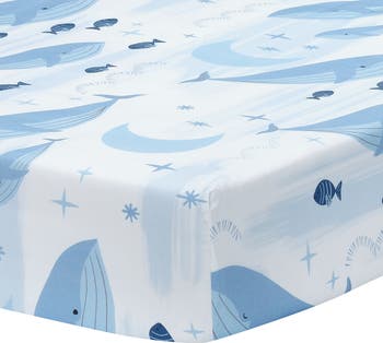 This soft, breathable 100% cotton fitted crib sheet has a repeated pattern of whales, fish, moons, stars, and waves in multiple shades of blue on a soft white ground. The fitted crib sheet has elastic all the way around ensuring a safe and secure fit on a standard size crib mattress measuring 28” X 52”.