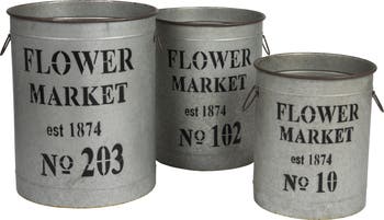 - These vintage-inspired metal buckets with "Flower Market" text design are a lovely and practical way to store and display the flowers, plants, or gardening tools