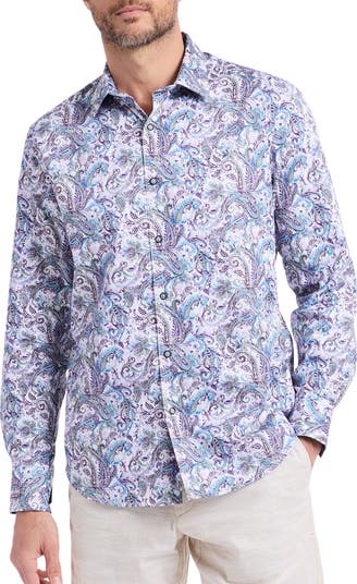 A vibrant paisley print highlights this button-up shirt cut from stretch cotton and detailed with contrast print trim.