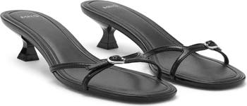 Slim faux-leather straps are centered by a polished buckle atop a minimalist slide sandal set on a flared kitten heel for a modest lift.