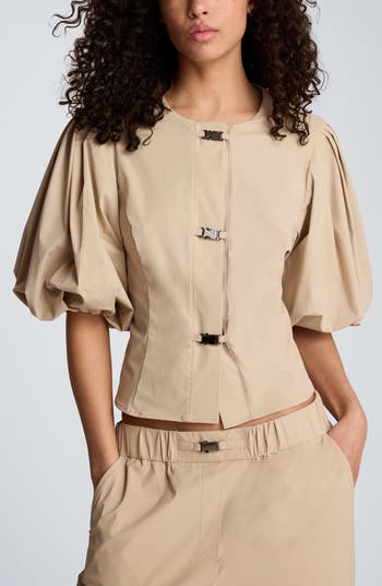Buckle-front closures bring utilitarian edge to this streamlined top, while voluminous bubble sleeves give the silhouette a striking, modern counterpoint.