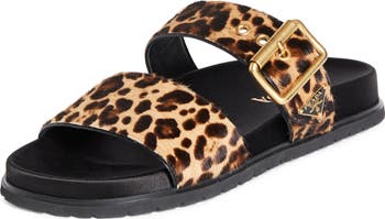 Prada's iconic triangle logo puts an understated house signature on this buckled slide sandal featuring lustrous genuine calf-hair straps covered with leopard spots.
