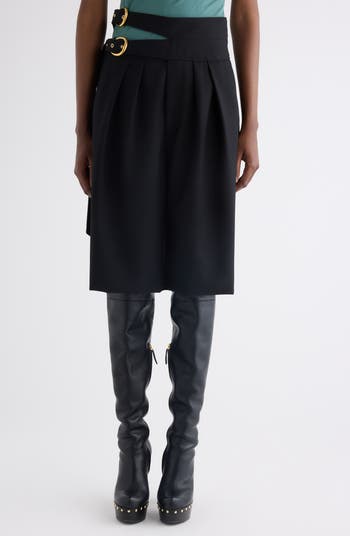 Expertly tailored from wool twill, these culotte-inspired wide-leg shorts feature a doubled split waistband that creates a cutout effect, with golden buckles cinching the waist.