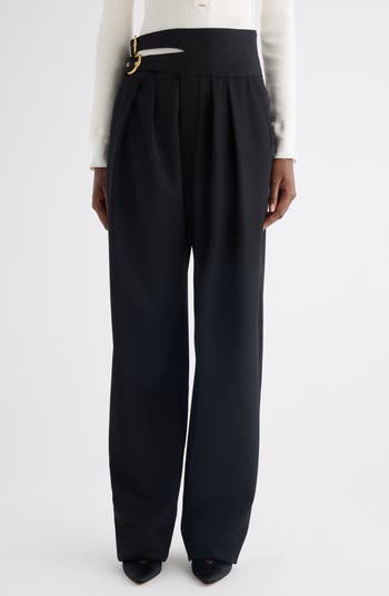 Expertly tailored from wool grain de poudre, these high-waisted pants feature a doubled split waistband that creates a cutout effect, with golden buckles cinching the waist.