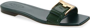 A brushed‑metal logo buckle elegantly accents the adjustable strap of this smooth Italian-goatskin sandal with a sharply squared toe.