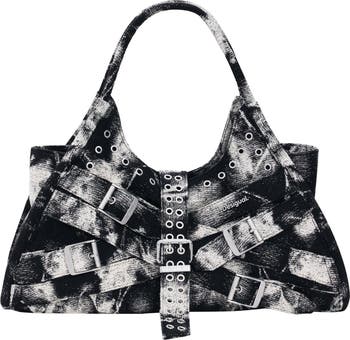 Decorative straps and polished grommet hardware dial up the modern attitude of this versatile denim satchel.