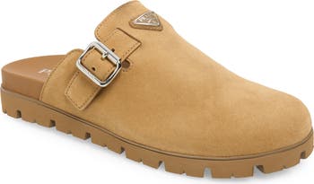 An enameled metal triangle logo brings signature branding to this suede mule that's the ultimate in casual sophistication—and comfort thanks to its contoured footbed.