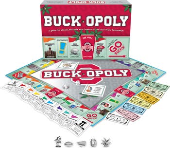The Buck-Opoly board game is perfect for Ohio State University alumni, students and future grads. Tokens include drum major, buckeye leaf, football, Brutus, letter O. Board Spaces include the oval, high street, Ohio stadium, coach woody Hayes, and varsity club. Late for the Sky Buck-Opoly Board Game is designed for all ages, Adults and Children.