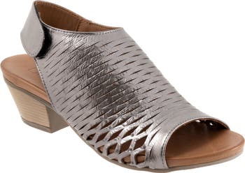 Perforated leather keeps things breezy and chic on this easygoing slingback sandal lifted by a stacked heel.
