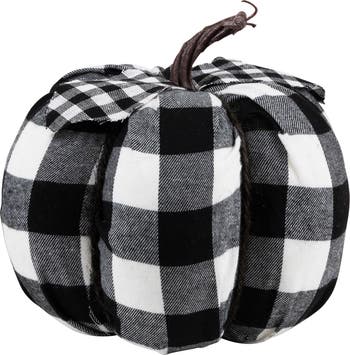 Give your fall décor a stylish farmhouse touch with this pumpkin decoration. Featuring a bold black and white buffalo check pattern, this pumpkin blends rustic charm with modern design, making it a versatile accent for fall decorating. The soft plaid fabric covering creates a cozy, inviting look, while the brown stem with curling vines completes the harvest-inspired design with a natural finish. Perfect for tabletops, mantels, shelves, or entryway displays, this buffalo plaid pumpkin fits beautifully with both classic autumn décor and contemporary farmhouse themes. Its neutral black and white tones allow it to complement a wide variety of color palettes, pairing easily with orange, gold, or natural harvest accents like gourds, leaves, or acorns. Crafted for long-lasting seasonal use, this tabletop pumpkin is lightweight, durable, and designed to maintain its striking appearance year after year. Display it on its own as a simple yet eye-catching accent, or arrange it with other pumpkins in different textures and sizes for a layered centerpiece. Whether styled for a cozy fall gathering, Thanksgiving dinner, or everyday autumn décor, this black and white pumpkin is a timeless piece that enhances any fall display. Product Features: Black and white buffalo check pattern Plastic brown stem with traditional plaid fabric leaves Each rib is separated by strands of twisted black jute twine Recommended for indoor use only Dimensions: 6.5" high x 7" diameter Material(s): fabric