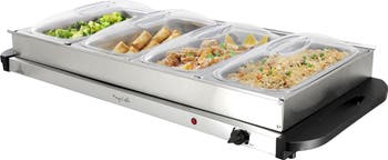 The MegaChef Buffet Server & Food Warmer With 4 Removable Sectional Trays , Heated Warming Tray and Removable Tray Frame is designed with you in mind. This ultimate party sidekick will make your guests feel as though they are being served a delicious hot meal at the most exclusive banquet. You will love the versatility of this wonderful buffet server at your next party or gathering. If you are in need of keeping prepared meals warm enough to serve through out the day or night this server has you covered. This large capacity buffet server and warming tray offer you the ability to serve food that may be warmed in the stainless steel containers or on the warming tray which is the base of the unit. The warming tray comes with hard mounted side handles to ensure that you can easily transport your buffet server from one location to another without worry. This lightweight and compact portable food warmer is safe to use on your kitchen counters or serving tables.Having quality stainless steel containers to serve your meals in will give you piece of mind, and you'll need not worry about leaving these containers in the sink overnight! MegaChef understands that you have a variety of surfaces on which meals may be served, for added protection this unit features 4 bottom legs which provide spacing between your surfaces and the buffet server. In addition to the large capacity stainless steel food warming containers, you'll also have the option of using the base warming tray to keep sauces, appetizers and much more warmed up for your guests by using the large base warming tray. All in all, this unit will have you covered from the beginning of your party to the very end!VERSATILITY: Give yourself the gift of ease and versatility with this beautiful buffet server. In addition to the large capacity stainless steel food warming containers, you'll also have the option of using the base warming tray to keep sauces, appetizers and much more warmed up for your guests by using the large base warming tray. All in all, this unit will have you covered from the beginning of your party to the very end!HEALTHY SERVING: With Stainless Steel Food Containers and a Stainless Steel Base Warming Tray, you'll have piece of mind knowing that your meals are being served with restaurant quality.EASY PORTABILITY: The warming tray comes with hard mounted side handles to ensure that you can easily transport your buffet server from one location to another without worry. This lightweight and compact portable food warmer is safe to use on your kitchen counters or serving tables.INCLUDED WITH YOUR BUFFET SERVER AND WARMING TRAY: Heating Base Tray measuring in at : 2.2" in Height by 14.5" Inches in Width by 25.5" in Length. Heating Base Tray Warming Surface Measuring in at 14 Inches in Width by 20.75" Inches in Length. Food Container Base Tray Frame Measuring in at 20.75 Inches in Length by 14.75 Inches in Width. Two Large Capacity Containers Measuring in at 12.75 Inches in Length by 7 Inches in Width by 2.5 Inches in Height. Two Medium Capacity Containers Measuring in at 6.5 Inches in Length by 7 Inches in Width by 2.5 Inches in Height. Two Clear Large Capacity Container Lids. Two Clear Medium Capacity Container Lids.