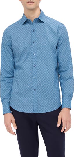 A subtle geometric print details a refined button-up shirt made from stretchy, breathable cotton for a flexible fit.