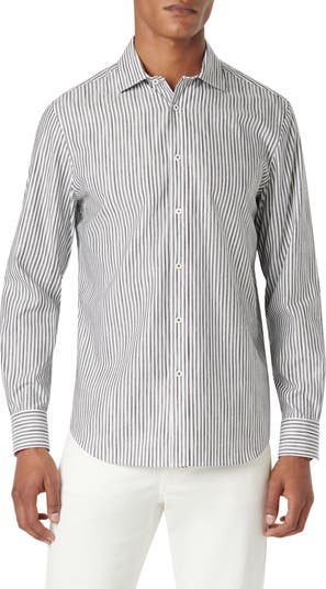 Dyed pinstripes give an artistic touch to a crisp button-up shirt enhanced with comfortable stretch.