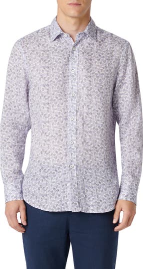 Effortlessly transition from office hours to happy hour in this linen button-up designed with a classic raised placket and hazy leaf pattern.