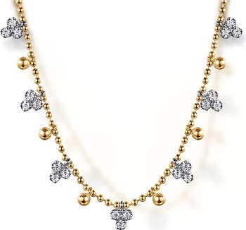 Diamond clusters and spherical beads alternate sparkle and polish on this lovely 14-karat gold frontal necklace.