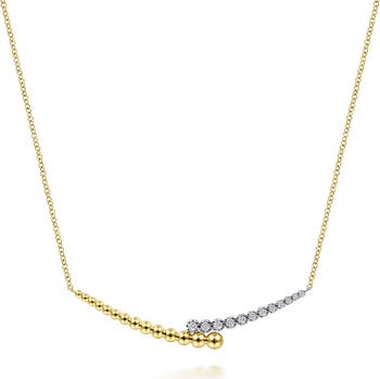 Graduated bars of icy diamonds and 14-karat gold beads meet at the center of this delicate chain necklace exuding elegant sparkle and gleam.