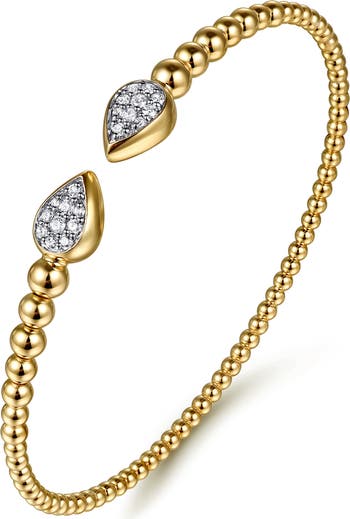 Diamond-pavé pear stations cap the ends of this beaded cuff bracelet cast in gleaming 14-karat gold.