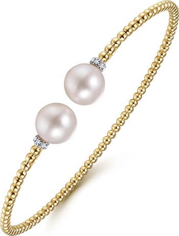 Pavé diamonds sparkle at the base of the large pearls that cap the ends of this beaded cuff bracelet cast in gleaming 14-karat gold.