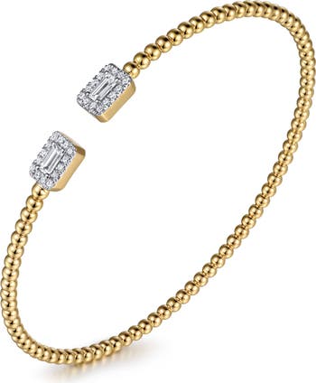 Icy diamond baguettes cap the open ends of this beaded cuff bracelet cast in gleaming 14-karat gold.