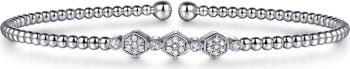 Icy diamonds sparkle in geometric formations at the center of this beaded cuff bracelet cast in 14-karat-white gold.