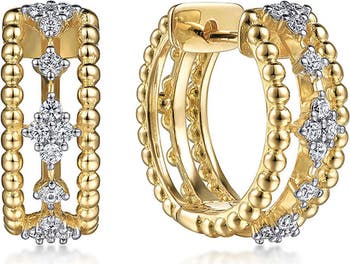 Twinkling diamonds appear to float in the negative space of these cutout 14-karat gold hoop earrings framed in beaded trim.