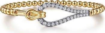 Icy diamonds illuminate the airy link that secures this beaded bracelet cast in gleaming 14-karat gold.
