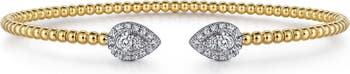 Diamond-filled pear stations cap the ends of this beaded cuff bracelet cast in gleaming 14-karat gold.