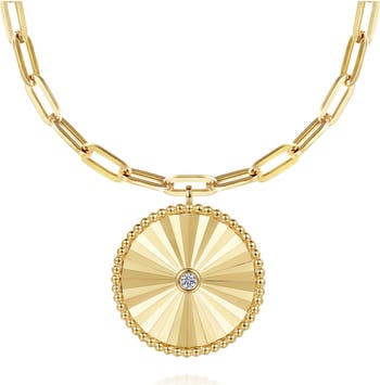 A sparkling diamond centers a beautifully textured medallion pendant suspended from an elegant chain necklace in warm 14-karat yellow gold.
