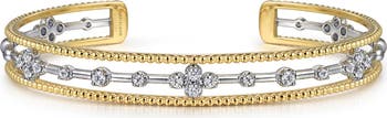 Sparkling round diamonds appear to float in open space on this 14-karat gold cuff bracelet gleaming in two tones.