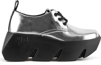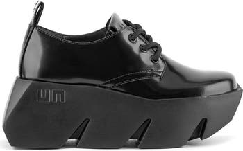 The Bull Derby is a playful remix of the classic lace-up derby, featuring a sleek patent leather upper. Its classic tailoring is contrasted with a voluminous, brutalist outsole embossed with the iconic United Nude logo.