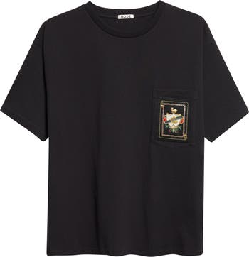 From Bode's tribute to American composer Morris 'Moose' Charlap comes this boxy cotton pocket T-shirt with bullion embroidery inspired by playing cards in a Lewis Carroll story—a tribute to Charlap’s 1966 score for 'Alice Through the Looking Glass.'