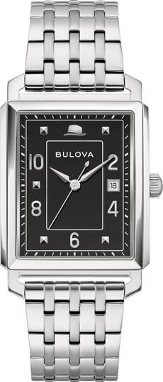Crisp numbers and rectangular markers enhance the minimalist aesthetic of this elegant watch set with a matching link bracelet and deployant clasp closure.