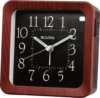 Molded case with woodgrain front. Large, easy-to-read black floating dial illuminates on demand. Visual window on front confirms the alarm is set, Ascending-volume alarm, then steady beep and six-minute snooze function. Rear set knobs are extended for easy setting. Silent sweep (no ticking) quartz movement.