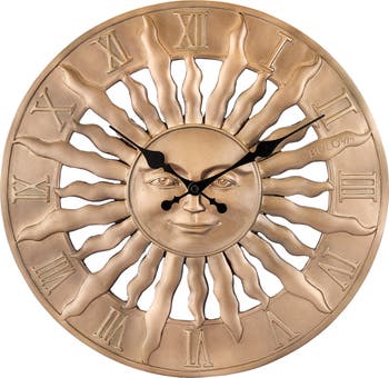 Three-dimensional raised radiating sun design with classic Roman numerals in a resin case that’s ideal for outdoors. The golden-bronze color is saturated into the resin, so no need to worry about weathering or the finish chipping over the years. Quartz movement with weather protecting movement cover.