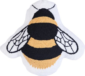 - This delightful shaped pillow features a charming bumble bee design with classic black and golden yellow stripes on the body, delicate white wings with detailed vein patterns, and curved antennae, all crafted using traditional loop hooking techniques on a crisp white background.